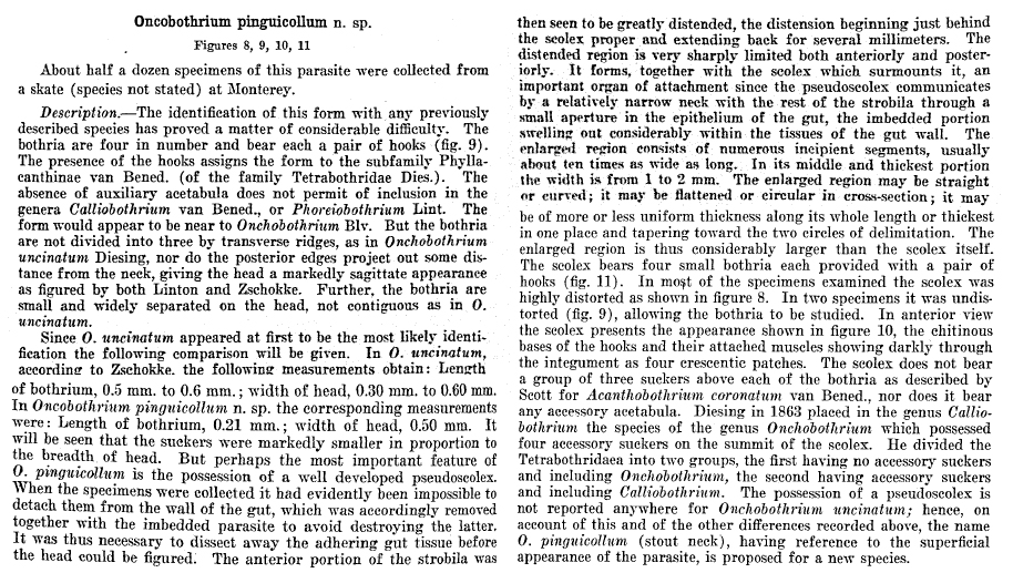 | Scientific Name Notes | Sleggs (1927) uses the incorrect spelling of the genus Onchobothrium (as Oncobothrium). |