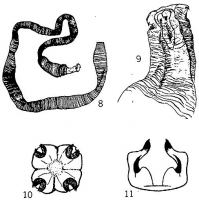 FIGURES 8-11. Oncobothrium [sic] pinguicollum n. sp. 8. View of entire worm, x ca. 5. The pseudoscolex is shown, surmounted by the somewhat distorted scolex. 9. Scolex, magnified, of a dried specimen. Below can be seen the beginning of the pseudoscolex. 10. Head in anterior aspect. 11. Hooks magnified.