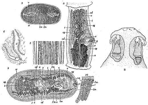 FIGURES 3, 5, 6 & 8-10. Onchobothrium tortum n. sp. 3. Transverse section of neck, showing longitudinal muscle bundles and vessels of the vascular system. Longer diameter of section 1.12 mm. 5. Longitudinal view of neck showing muscle bundles. Breadth 1.17 mm. 6. View of retracted cirrus, and vagina; from longitudinal section. 8. Posterior proglottis; balsam. Length 1.6 mm. 9. Transverse section of a somewhat younger proglottis than that shown in Figure 8. Longer diameter of section 1.12 mm. 10. Details of musculature. Abbreviations: c, retracted cirrus; cm, circular muscle layer; gp, genital pore; lm, longitudinal muscle bundles; o, ovary; sr, seminal receptacle; t, testes; u, uterus; v, vagina; vd, vas deferens; vg, vitellaria; w, longitudinal vessel.