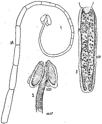 PLATE III. FIGURES 1-3. Orygmatobothrium angustum n. sp. 1. Orygmatobothrium angustum sp. nov., outline of strobile, enlarged 8 diameters. 2. Head and part of neck of same, enlarged 20 diameters. 3. Posterior segment of same, enlarged 20 diameters.