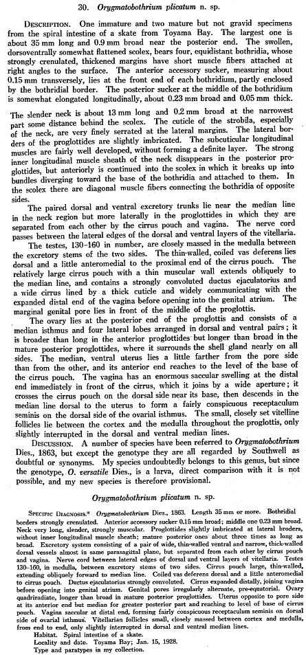 Yamaguti, S. 1934. Studies on the helminth fauna of Japan. Part 4. Cestodes of fishes. Japanese Journal of Zoology 6: 1-112. (510) Download PDF |