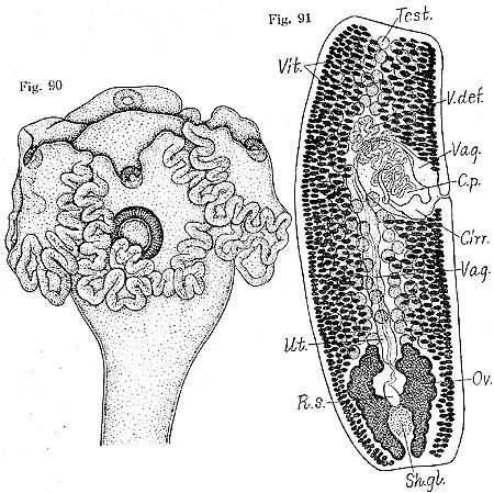 FIGURES 90 & 91. Orygmatobothrium plicatum n. sp. 90. Scolex. 91. Mature segment, dorsal view. Type 2.1 x 0.75 mm. Abbreviations: Cirr., cirrus; C.p., cirrus pouch; Ov., ovary; R.s., receptaculum seminis; Sh.gl., shell gland; Test., testis; [Ut., uterus;] Vag., vagina; V.def., vas deferens; Vit., vitellaria.