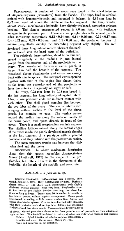 Scientific Name Notes Yamaguti (1935) proposed the name Anthobothrium exiguum to replace Anthobothrium parvum Yamaguti, 1934 which was preoccupied by A. parvum Stossich, 1895 regarded by Southwell to be a synonym of A. cornucopia Van Beneden, 1850