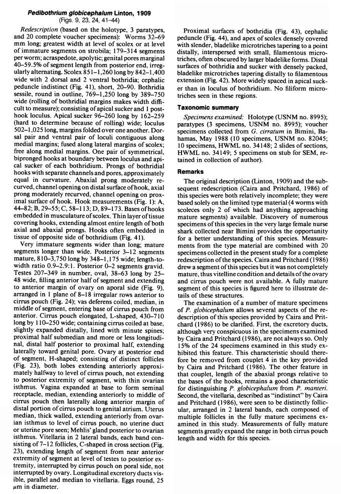 | Specimen Notes | Holotype (USNM no. 8995); paratypes (3 specimens, USNM no. 8995); voucher specimens collected from G. cirratum in Bimini, Bahamas, May 1988 (10 specimens, USNM no. 82045; 10 specimens, HWML no. 34148; 2 slides of sections, HWML no. 34149; 5 specimens on stub for SEM, retained in collection of author). |