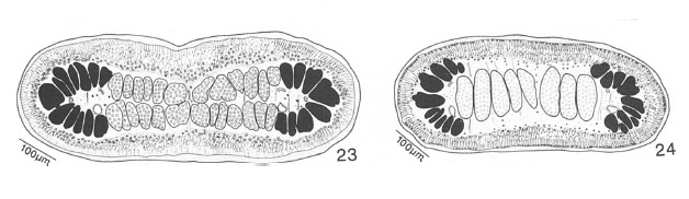 23. Section through ovarian region of voucher (HWML no. 34149) of P. globicephalum. 24. Section through region of testes of P. globicephalum. B, border between cortex and medulla; DE, dorsal