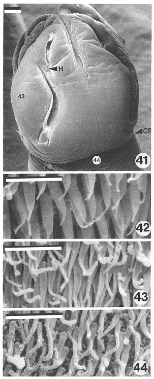 Microtriches on cephalic peduncle. Scale bar in Figure 41, 100 um; scale bar in Figures 42-44, 2 um
