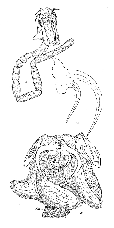 PLATE 3. FIGURES 17-19. Pedibothrium longispine gen. et sp. nov., from Ginglimostoma cirratum. 17. Sketch of a strobile, life; actual length of bothrium 0.35 mm. 18. Head, balsam; maximum diameter of head 0.32 mm. 19. Hook; actual length 0.16 mm. Abbreviations: lm, longitudinal muscle.