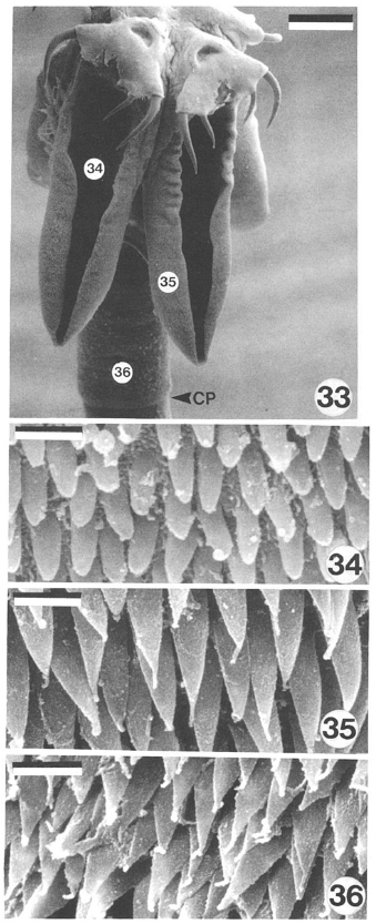 FIGURES 33-36. Scanning electron micrographs of Pedibothrium longispine. 33. Scolex of P. longispine; locations at which Figures 34-36 were taken are indicated with corresponding numbers; arrow at CP marks end of cephalic peduncle. 34. Microtriches on distal bothridial surface of P. longispine. 35. Microtriches on proximal bothridial surface of P. longispine. 36. Microtriches on cephalic peduncle of P. longispine.