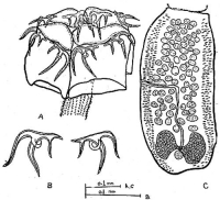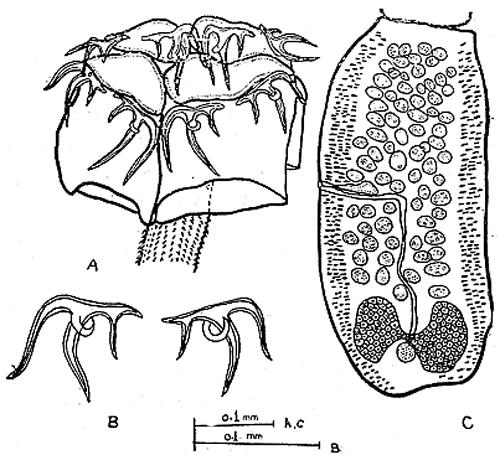 FIGURE 1 A-C. Phoreiobothrium arabiansi n. sp. A. Scolex. B. Hooks. C. Mature segment.