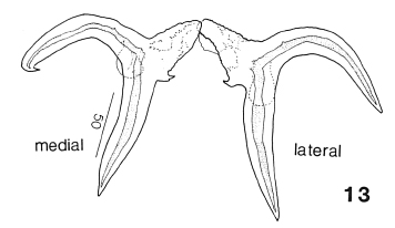 FIGS. 13-17. Phoreiobothrium exceptum, syntypes, USNM No. 7688. Fig.13. Hooks composing bothridial pair (left scolex); note tiny basal prongs and internal channels.