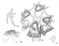 FIGS. 13-17. Phoreiobothrium exceptum, syntypes, USNM No. 7688. Fig. 14. Hook illustrating pore (middle scolex). Fig. 15. Enlarged view of apical sucker demonstrating five muscular protrusions (right scolex). Fig. 16. Scolex (second scolex from right). Fig. 17. Neck spines (second scolex from right).