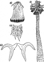 PLATE 4. FIGURES 41-44. Phoreiobothrium exceptum n. sp. 41. Scolex and anterior part of the strobile; balsam; diameter of scolex 0.56. 42. Bothrium; balsam; length 0.47. 43. Pair of hooks; maximum length 0.13. 44. Spines from neck; maximum length 0.036.