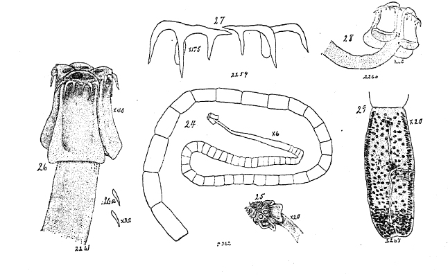 PLATE IV. FIGURES 24-29. Phoreiobothrium lasium n. sp. 24. Outline of strobilie, enlarged 6 diameters. 25. front view of head, enlarged 209 diameters. 26. Lateral view of head of another specimen, enlarged 40 diameters. 26a. Spines from neck of same, enlarged 350 diameters. 27. Compound hooks from one bothrium, enlarged 175 diameters. 28. Another specimen with many spines on rthe neck, and showing striae on bothria somewhat flattended under compressor; enlarged 20 diameters. 29. Posterior mature segment, enlarged 20 diameters. All the figures i n this plate made from alcoholic or mounted specimens, by Mrs. Edwin Linton.