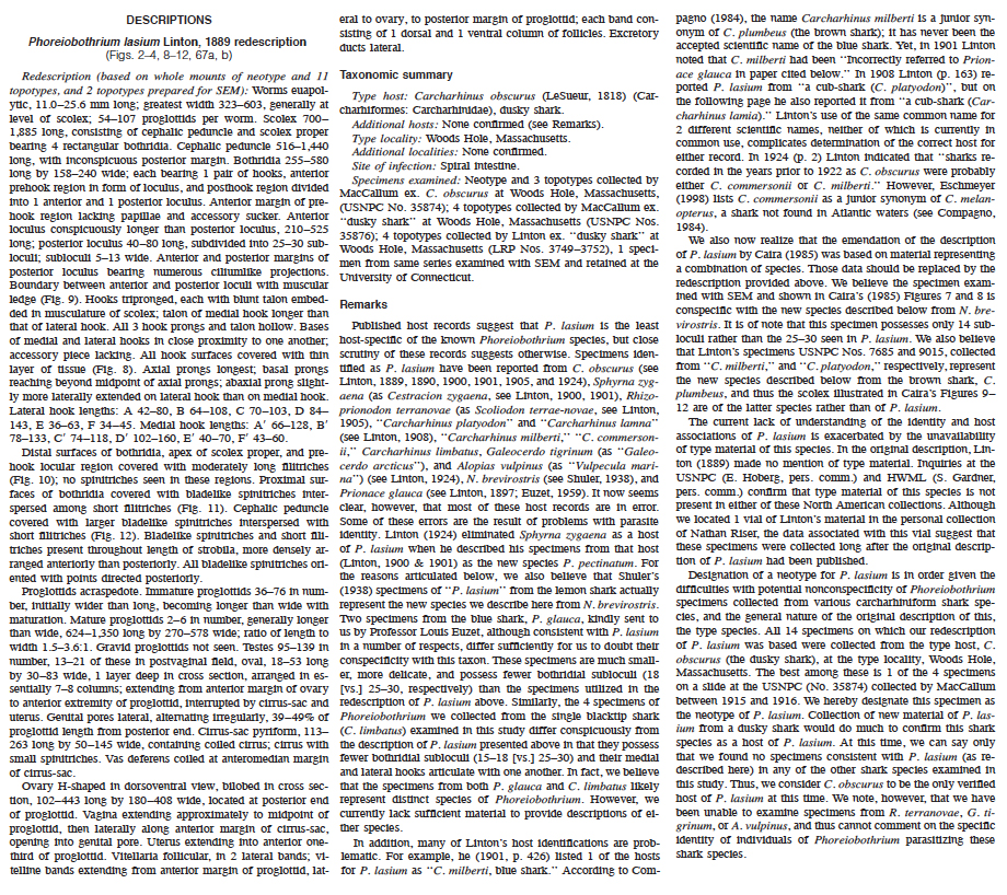 | Scientific Name Notes | Linton gives the host as “Dusky Shark (Carcharias obscurus)”; Caira (1985) also includes a redescription of this species (Cit# 88). |