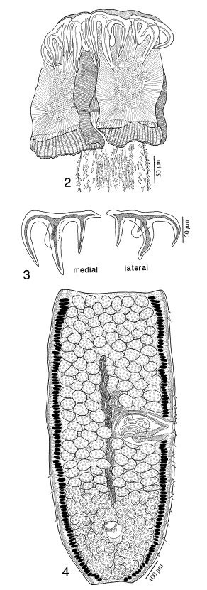 FIGURES 2–4. Phoreiobothrium lasium. (2) Scolex. (3) Hooks. (4) Mature proglottid.