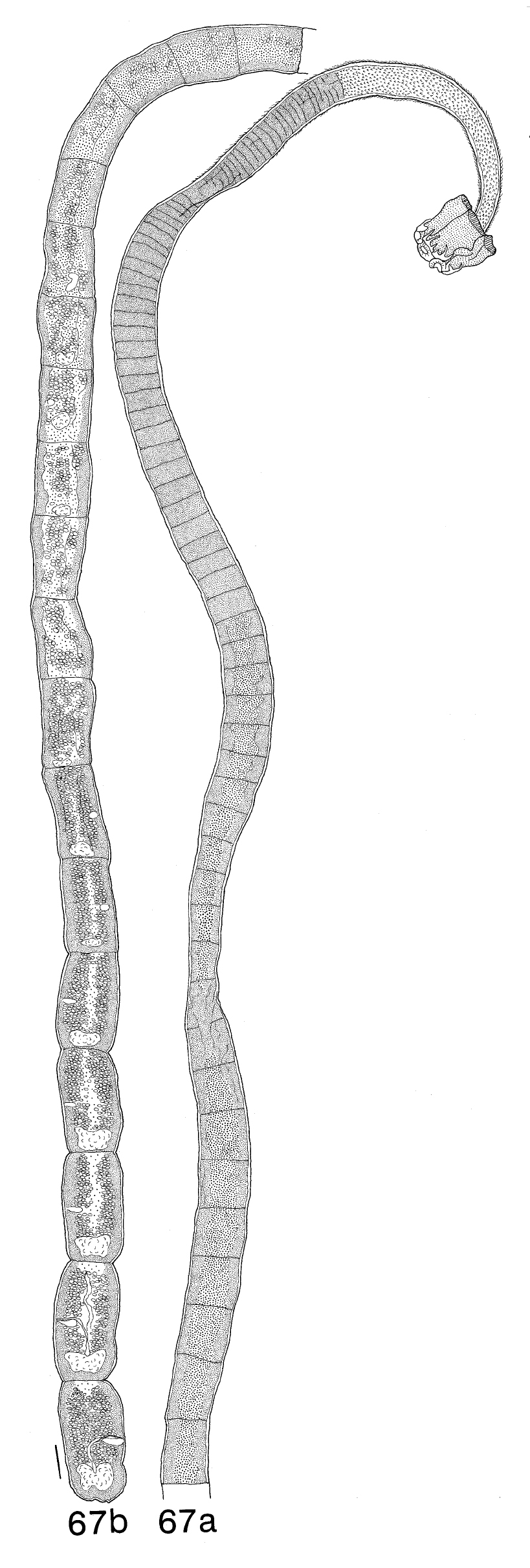 FIGURES 67–73. Whole worms drawn to same scale. (67a, b) Phoreiobothrium lasium.