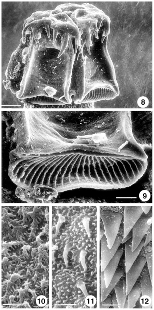FIGURES 8–12. Scanning electron micrographs of Phoreiobothrium lasium. (8) Scolex; scale bar, 50 µm. (9) Enlarged view of subloculi; scale bar, 20 µm. (10) Enlarged view of distal bothridial surface; scale bar, 1 µm. (11) Enlarged view of proximal bothridial surface; scale bar, 1 µm. (12) Enlarged view of cephalic peduncle; scale bar, 5 µm.