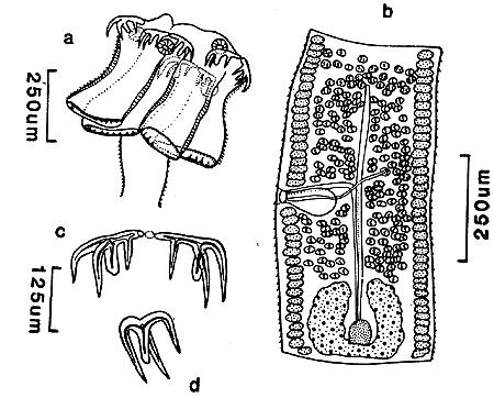 Figs. a-d. Phoreiobothrium ratnagiriensis sp. nov. a. Scolex, b. Mature proglottid. c, d. Hooks from scolex.