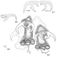 FIGS. 21 - 24. Phoreiobothrium triloculatum. Fig. 21. Hooks composing bothridial pair, topotype, USNM No. 35804. Fig. 22. Hook illustrating pore, metatype, USNM No. 7686 (right specimen). Fig. 23. Neck spines, metatype, USNM No. 7686 (middle specimen). Fig. 24. Scolex. metatype, USNM No. 7686 (middle specimen).
