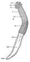 FIGURE 8. Pelichnibothrium caudatum n. sp. 8. Whole worm. Abbreviation: as-apikaler saugnapf, hs-hilssaugnapf, b-bothridien, h-hoden, scl-subcuticularer längsmuskel, st-segmentierter teil, exs-unlabeled[sic] excretionsstämme, sch-schwanz, exb-unlabeled [sic] excretionsblase.