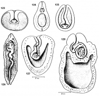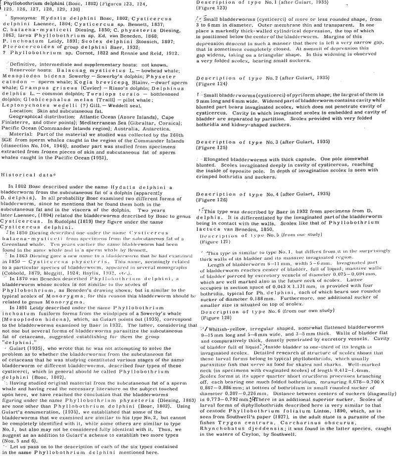 123. Phyllobothrium delphini (Bosc, 1802). Larval type 1 (after Guiart, 1935). 124. Phyllobothrium delphini (Bosc, 1802). Larval type 2 (after Guiart, 1935). 125. Phyllobothrium delphini (Bosc, 1802). Larval type 3 (after Guiart, 1935). 126. Phyllobothrium delphini (Bosc, 1802). Larval type 4 (after Baer, 1932). 127. Phyllobothrium delphini (Bosc, 1802). Larval type 5 (original).
