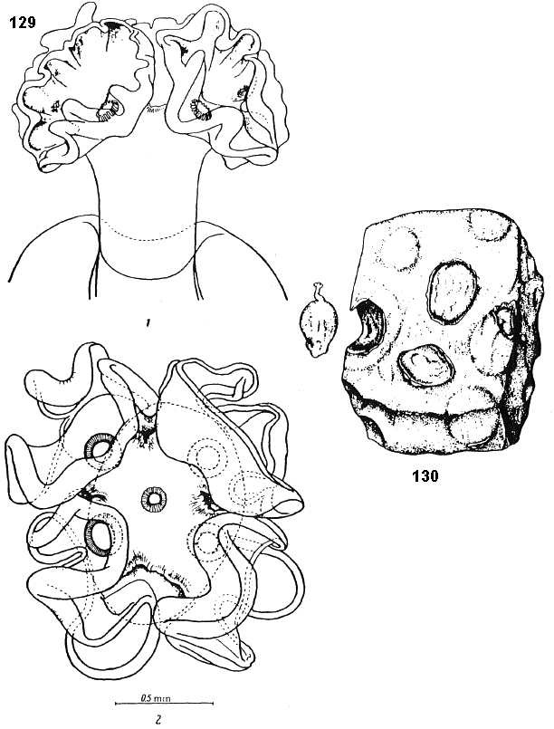 128. Phyllobothrium delphini (Bosc, 1802). Larval type 6 (original). 129. Phyllobothrium delphini (Bosc, 1802): 1 - scolex; 2 - apical view of same (original).