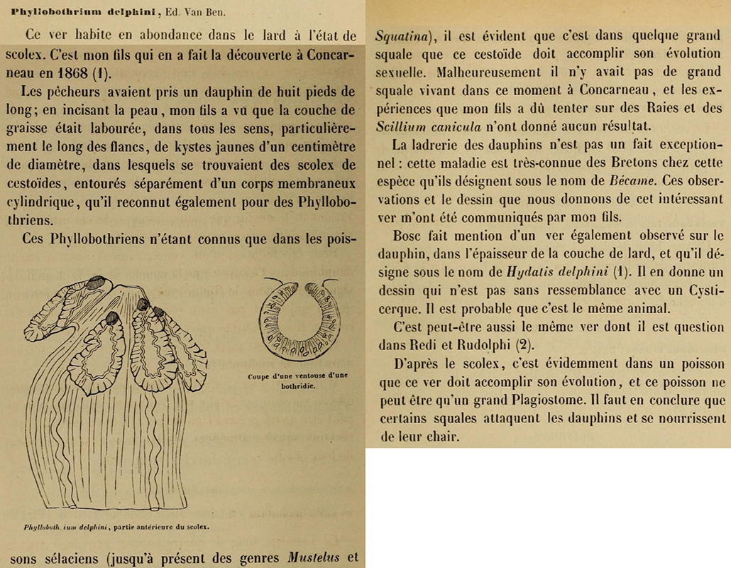 | Scientific Name Notes | van Beneden described the discovery of this species in a 1868 communiquée, but did not use the name Phyllobothrium delphini until 1870. The larval name Hydatis delphini Bosc, 1802 was originally used for this species. As Hydatis is a larval genus name, P. delphini has been retained for use in referring to this species. |