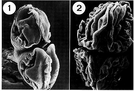 FIGURES 1, 2. Phyllobothrium discopygi n. sp. 1. Scolex, scanning election microscopy, x70. Note the contracted pedicles. 2. Scolex, note marginal loculi and accessory sucker (arrow).