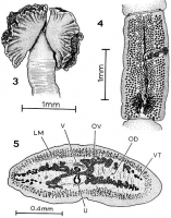 FIGURES 3-5. Phyllobothrium discopygi n. sp. 3. Scolex holotype. 4. Mature segments from terminus of strobila. 5. Transverse section of mature segment in region of ovary. Abbreviations: LM, longitudinal muscle; OV, ovary; OD, osmoregulatory duct; U, uterus; V, vagina; VT, vitelline follicles.
