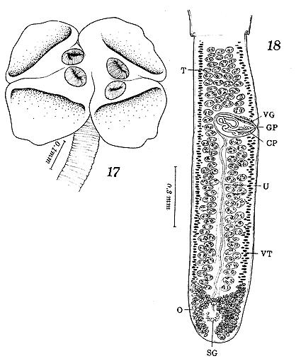 PLATE IV. FIGURES 17 & 18. Phyllobthrium filiforme n. sp. 17. Scolex of Phyllobothrium filiforme, apical view. 18. Mature proglottis of Phyllobothrium filiforme, dorsal view. Abbreviations: CP, cirrus pouch; GP, genital pore; O, ovary; SG, shell gland; T, testis; U, uterus; VG, vagina; VT, vitellaria.