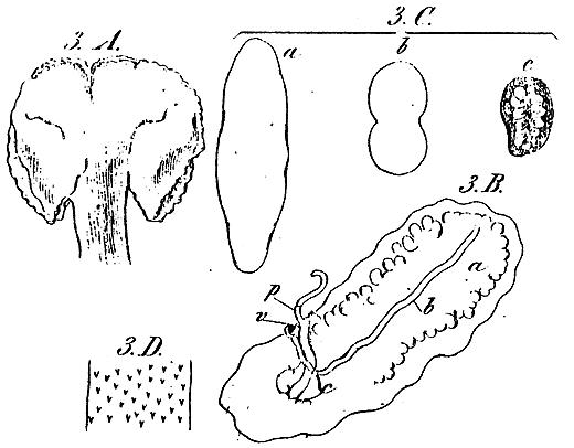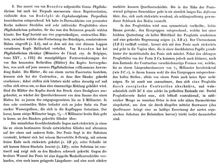 PLATE Ia. FIGURE 3 A-D. Phyllobothrium gracile n. sp. A. Kopf mit dem dünnen Halse. B. Proglottis; a heller Mitteltheil, mit Eiern erfüllt; b Uterus-Hauptstamm, sich mit der Wurzel des Penis c kreuzend und sich gleich hinter dem hervorgestülpten Penis p in v mündend. C. Contractile Proglottidenreste mit reifen Eiern, ohne nachweisbarem Penis (schwach vergrössert). D. Feinstachelige Penisscheide (stark vergrössert).