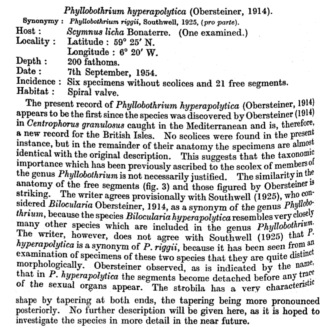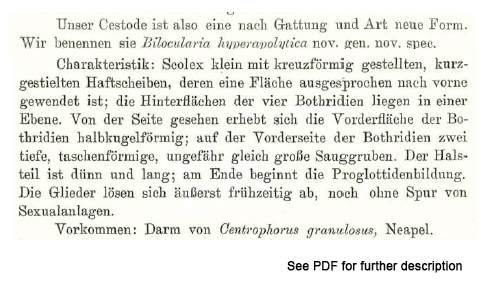 Obersteiner, W. 1914. Über eine neue Cestodenform Bilocularia hyperapolytica nov. gen. nov. spec., aus Centrophorus granulosus. Arbeiten aus den Zoologischen Instituten der Universität Wien und der Zoologischen Station in Trieste 20: 109-124. (585) Download PDFWilliams, H. H. 1958. Some Phyllobothriidae (Cestoda: Tetraphyllidea) of elasmobranchs from the western seaboard of the British Isles. Annals and Magazine of Natural History. Series 13 1: 113-136. (483) Download PDF |