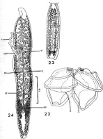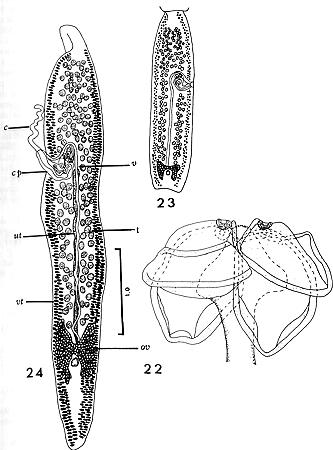 FIGURES 22-24. Phyllobothrium leuci n. sp. 22. Scolex. 23. Mature proglottid. 24. Apolytic proglottid. Abbreviations: c, cirrus; cp, cirrus pouch; ov, ovary; t, testes; ut, uterus; v, vagina; vt, vitellaria.