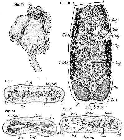 FIGURES 79-83. Phyllobothrium marginatum n. sp. 79. Scolex. 80. Mature segment; dorsal view. Type 1.6x0.8 mm. 81-83. Transverse sections of mature segment. Abbreviations: Atr., genital atrium; C.p., cirrus pouch; D.ej., ductus ejaculatorius; D.sem., ductus seminalis; Ex., excretory system; G.d., germiduct; G.p., genital pore; Inn.m., inner longitudinal muscle; n., nerve trunk; Ov., ovary; R.s., receptaculum seminis; Test., testis; Ut.d., uterine duct; Vag., vagina; V.def., vas deferens; Vit., vitellaria.