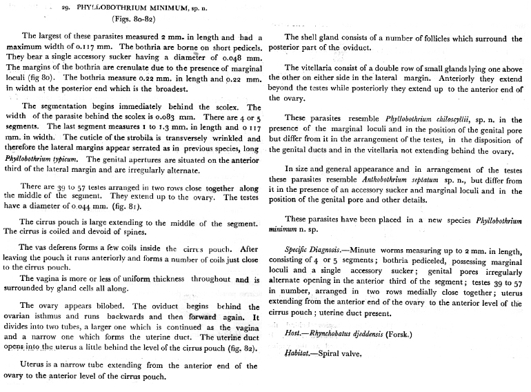 Figs. 80-82. Phyllobothrium minimum sp. n. Fig. 80A single bothridium. Fig. 81. Mature segment. Fig. 82. Loose segment, showing genital ducts. Abbreviations: c.l., cellular layer; c.p., cirrus pouch; cu., cuticle; e., egg; o., ovary; o.d., oviduct; p., proboscis; tes., testes; u., uterus; v., vagina; v.d., vas deferens; vi., vitellaria; vi.d., vitelline duct; u.d., uterine duct.