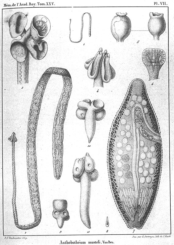 PLANCHE VII. FIGURES 1-11. Anthrobothrium musteli n. sp. 1. Strobila adulte et complet de grandeur naturelle. 2. Le meme vu a la loupe. 3. Tete du scolex montrant les quatre bothridies ouvertes; c’est surtout quand le ver commence a s’affaiblir que cette forme apparait. 4. Tete du meme, quand le ver est tres-vivant et s’efforce d’avancer. 5. Deux bothridies, vues de profil, ayant la forme d’un individu aussi tres-vivant. 6. Bothridie comprimee entre deux lames de verres, montrant une couche musculaire feutree et des fibres ordinaires libres; on distingue bien les deux ventouses, une au centre et une autre sur le bord. 7. Proglottis adulte et libre. 8. --de grandeur naturelle. 9-11. Trois strobilas en voie de developpement.