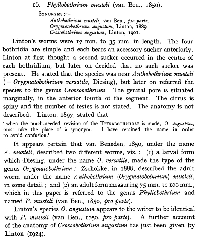 | Scientific Name Notes | Phyllobothrium musteli (Van Beneden, 1849) Southwell, 1925 was originally described as Anthobothrium musteli Van Beneden, 1850. This description contains two species, which Ruhnke (2011) treated as Orygmatobothrium (Van Beneden, 1850) Diesing, 1863 and Paraorygmatobothrium musteli (Van Beneden, 1850).no figures in original description of Van Beneden, 1849 see Van Beneden (1850) for a more complete description (incl. figures) of this species Southwell (1925) stated that “it appears certain that van Beneden, 1850, under the name A. musteli, described twp different worms, viz.: (1) a larval form which Diesing, under the name O. versatile, made the type of the genus Orygmatobothrium; Zschokke, in 1888, described the adult worm under the name Anthobothrium (Orygmatobothrium) musteli, in some detail; and (2) an adult form measuiring 75 mm. to 100 mm., which in this paper is referred to the genus Phyllobothrium and named P. musteli (van Ben., 1850, pro parte).” |