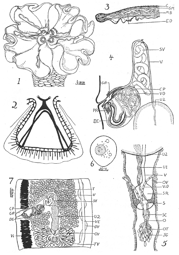 FIGURES 1-7. Phyllobothrium radioductum n. sp. 1. Scolex. 2. Diagram of the excretory ducts of a bothridium. 3. Section of a small portion of the margin of a bothridium. 4. Semi-diagrammatic view of the genital atrium and adjacent genital ducts. 5. Detail of the female reproductive system from a detached mature proglottis. 6. Uterine egg showing embryo. 7. Nearly mature proglottis from the posterior part of a strobila, partial reconstruction. Abbreviations: c, cuticle; cp, cirrus pouch; de, ejaculatory duct; dv, dorsal excretory vessel; ed, excretory duct; ga, genital atrium; mb, muscle bundle; o, oviduct; ot, ootype; ov, ovary; pr, prostatic cells; s, swallowing apperatus; sc, seminal canal; sg, shell gland; sm, superficial muscle; sr, seminal receptacle; sv, seminal vessicle; t, testis; tv, transverse excretory vessel; u1, primary uterus; u2, second uterus; v, vagina; vd, vas deferens; ve, ventral excretory vessel; vi, vitellarium.