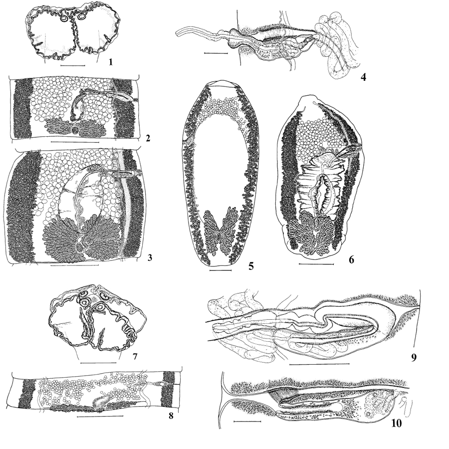 section through terminal genital ducts in mature proglottis. Scale-bars: 7, 1 mm; 8, 300 μm; 9, 150 μm; 10, 100 μm. |