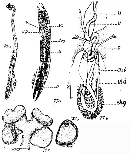 Figs. 76-77. Phyllobothrium typicum sp. n. fig. 76a. Entire specimen. fig. 76b. A single bothridium showing the accessory sucker. fig. 76c. Scolex. fig. 77a. Mature segment. fig. 77b. The region of the ovary showing the genital duct. Abbreviations: c.p., cirrus pouch; o., ovary; o.d., oviduct; sh.g., shell gland; tes., testes; u., uterus; v., vagina; vi, vitellaria; vi.d., vitelline duct.