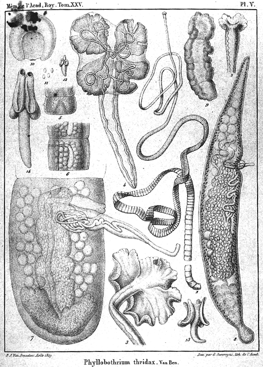 PLATE V. FIGURES 1-14. Phyllobothrium thridax n. sp. 1. Strobila adulte et complet. 2. La tete du meme un peu grossie. 3. La tete montrant la face dorsale des bothridies. 4. Scolex complet entre deux lames de verre montrant les canaux et la maniere dont ils se perdent en avant et en arriere, et la charpente musculaire feutree. 5. Quatre segments anterieurs. 6. D’autres plus avances. 7. Un autre segment plus avance encore. 8. Proglottis adulte et complet, vivant. 9. Segments monstrueux charges egalement d’oeufs; il ne donnent pas signe de vie. 10. Proglottis libres dans l’intestin, charges aussi d’oeufs. 1. Des oeufs isoles. 12-14. Jeunes scolex.