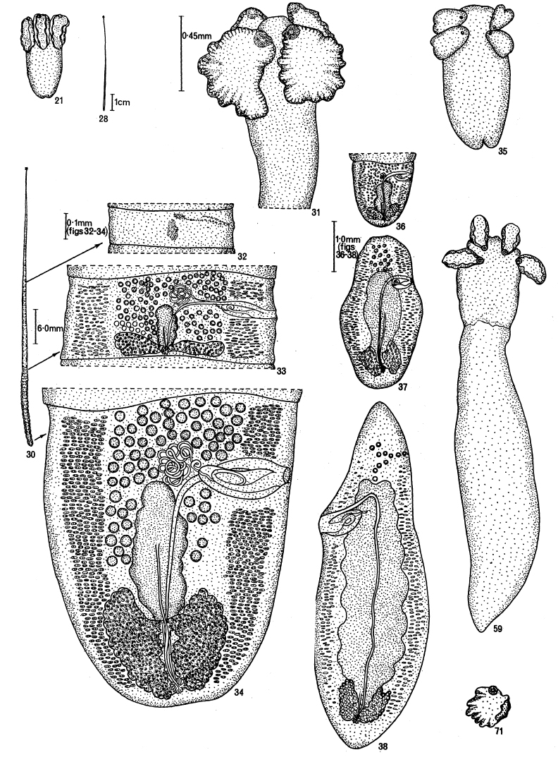 From Williams 1968 (Cit# 527); FIGURES 21, 28, 30-38, 59 & 71. Phyllobothrium minutum n. sp. 21. Immature specimen (post-plerocercoid?) of P. minutum sp. nov., from Raja fullonica. 28. [Whole worm]. 30. Complete strobila of mature adult, about 50 mm long. 31. Scolex of largest specimen found, drawn from temporary whole mount in formaldehyde. 32-34. Proglottids from different regions of the same strobila, dorsal view. 35. Immature specimen (post-plerocercoid?) to same scale as figure 31. 36-38. Posterior proglottid of strobila and two free proglottids, all to same scale to show growth change, as uterus becomes filled with eggs. 59, 71. P. minutum sp. nov. from Raja fullonica.