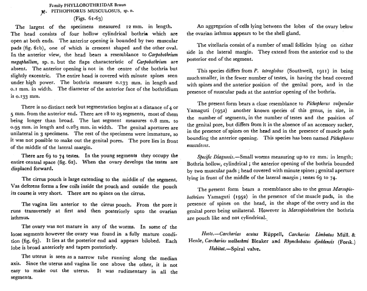 Subhapradha, C. K. 1955. Cestode parasites of fishes of Madras Coast. Indian Journal of Helminthology 7(2): 41-132.
