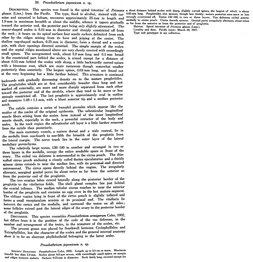 Yamaguti, S. 1934. Studies on the helminth fauna of Japan. Part 4. Cestodes of fishes. Japanese Journal of Zoology 6: 1-112. (510) Download PDF |