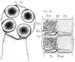 FIGURES120 & 121. Prosobothrium japonicum n. sp. 120. Scolex; apical view. Type 0.81 mm in diameter. 121. Maturing segments, ventral view. Testes and vitellaria shown unilaterally. Abbreviations: C.p., cirrus pouch; G.p., gential pore; Ov., ovary; Sh.gl., shell gland; Test., testis; Ut., uterus; Vag., vagina; Vit., vitellaria.