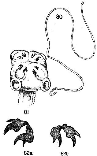 FIGURES 80-82. Prosthecobothrium trygonis n. sp. 80. Whole worm. 81. Head of the same. 82. Hooks from the head, highly magnified.