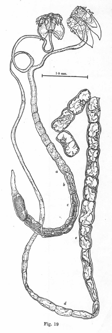 Fig 19. D. paciferum n. sp. Whole mount of both syntypes - the scolex of the younger strobilus had begun to disintegrate when fixed, and its halves are displaced, and for the same reason the ‘neck’ of the other specimen is probably unduly elongated. Vitellaria in the posterior proglottides of the younger specimen completely obscure the other structures. (the letters in a-e indicate regions illustrated in higher magnifications in Figs. 21-23).