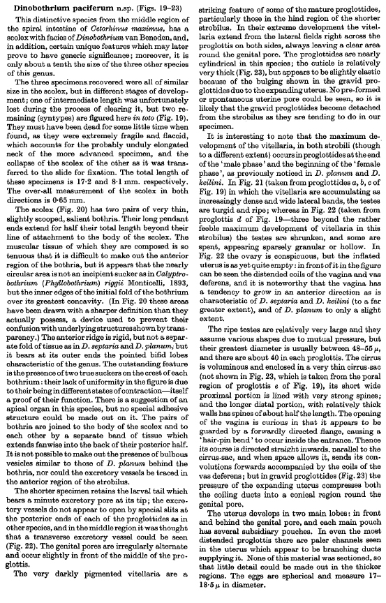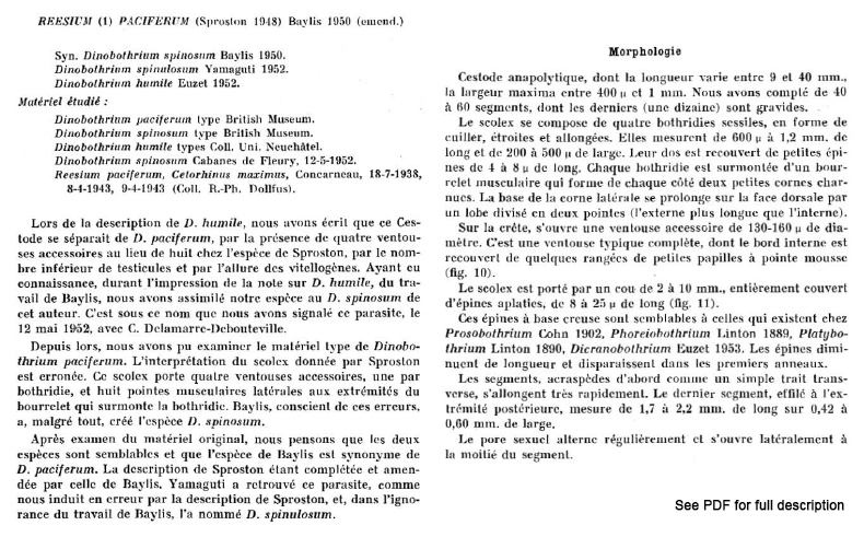 Sproston, N. G. 1948. On the genus Dinobothrium van Beneden (Cestoda), with a description of two new species from sharks, and a note on Monorygma sp. from the electric ray. Parasitology 39: 73-90. (452) Download PDFEuzet, L. 1955. Remarques sur le genre Dinobothrium Van Beneden 1889 (Cestoda-Tetraphyllidea). Annales de Parasitologie Humaine et Comparée 30: 174-192. (189) Download PDF |