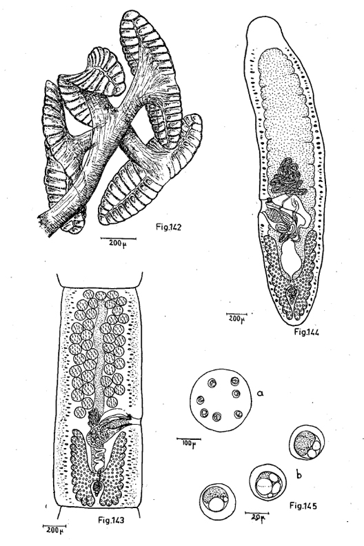 FIGURES 142-145. Rhinebothrium baeri n. sp. 142. Scolex. 143. Segment sexué. 144. Proglottis gravide. 145. a) Cocon, b) oeufs.