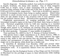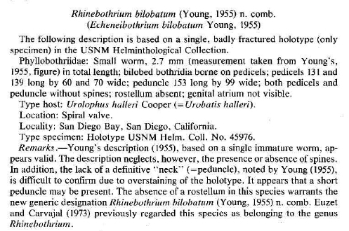 Young, R. T. 1955. Two new species of Echeneibothrium from the stingray Urobatis halleri. Transactions of the American Microscopical Society 74(3): 232-234. (517) Download PDFBall, D., L. Neifar, and L. Euzet. 2003. Proposition de Scalithrium n. gen. (Cestoda, Tetraphyllidea) avec comme espèce-type Scalithrium minimum (Van Beneden, 1850) n. comb. parasite de Dasyatis pastinaca (Elasmobranchii, Dasyatidae). Parasite 10: 31-37. (4500) Download PDF |
